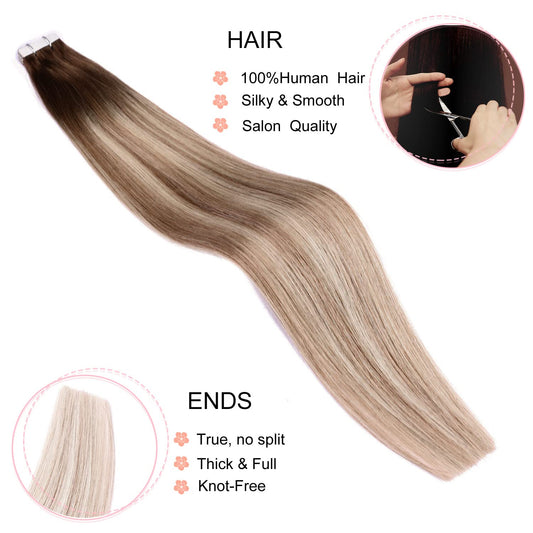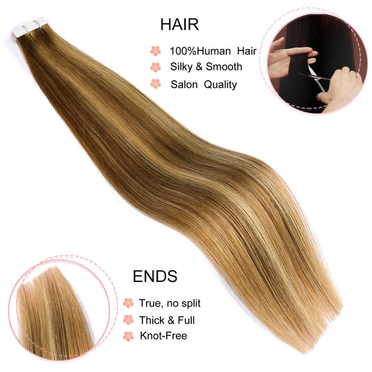 DIYOMO Tape in Hair Extensions Human Hair,#3/8/22 Darker Brown to Ash Brown and Blonde Hair Extensions Handcrafted Soft & Smooth Remy Hair Extensions for Women,2.5g/Pcs 50g/Pack,#3/8/22